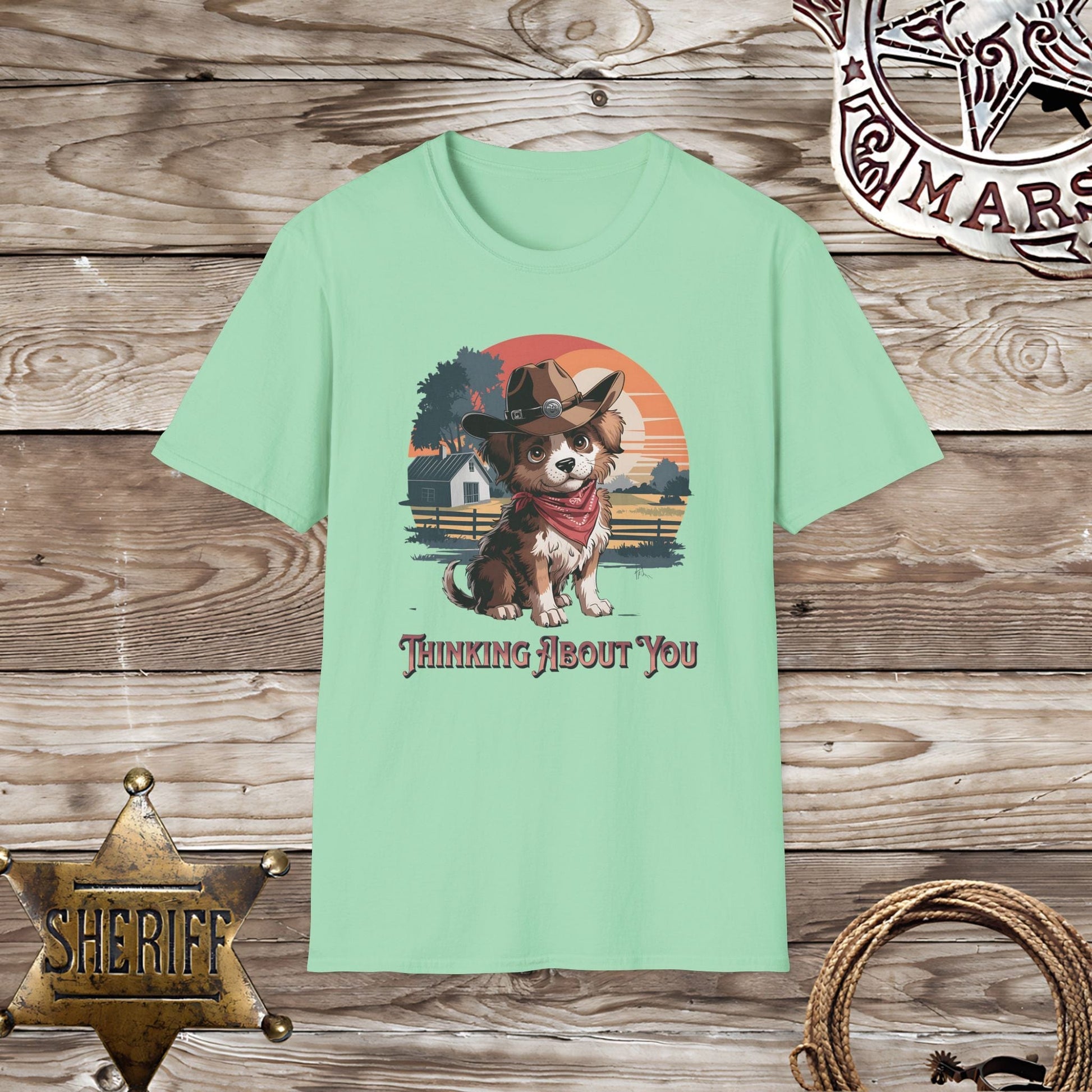 This unisex t-shirt will have you feeling the love with its adorable design of a dog in western wear thinking of you. Made with Softstyle material, it's both comfortable and stylish. Perfect for spreading love and joy (and making others jealous of your cute shirt!)