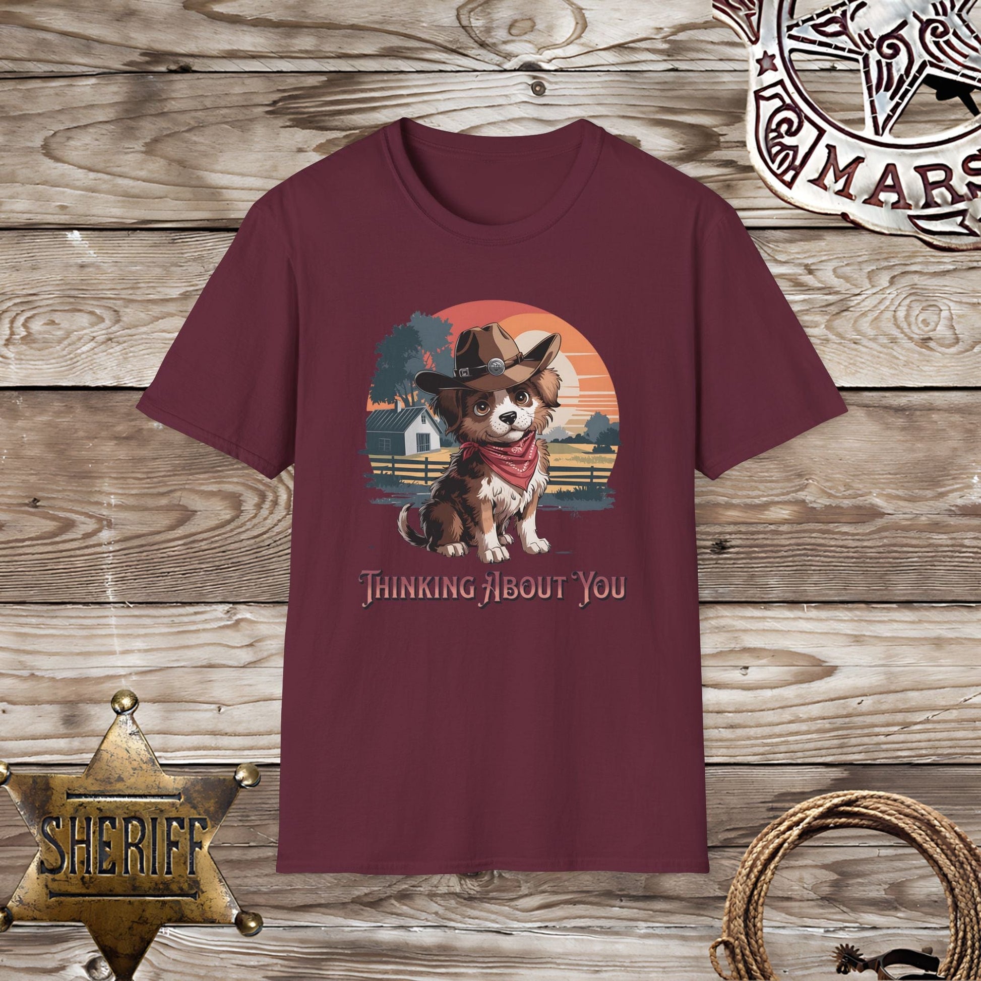 This unisex t-shirt will have you feeling the love with its adorable design of a dog in western wear thinking of you. Made with Softstyle material, it's both comfortable and stylish. Perfect for spreading love and joy (and making others jealous of your cute shirt!)